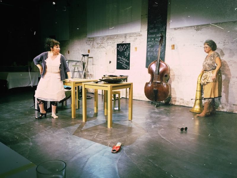 Mit viel Musik und restlos allem, was sie hatten, bewirteten die beiden Gastgeberinnen ihr Publikum, dass es eine krachende Lust war. Schüsse aus der Küche und schon roch man den Braten. Frischer Wein in alten Schläuchen! Auch der Perkussionist Matthias Daneck wurde eingespannt wo es den Weibern passte. Der reinste Genuss, musikalisch, theatralisch – und kulinarisch gekrönt mit dem köstlichen durchkomponierten Dreigangmenü aus Anna Areggers Küche.